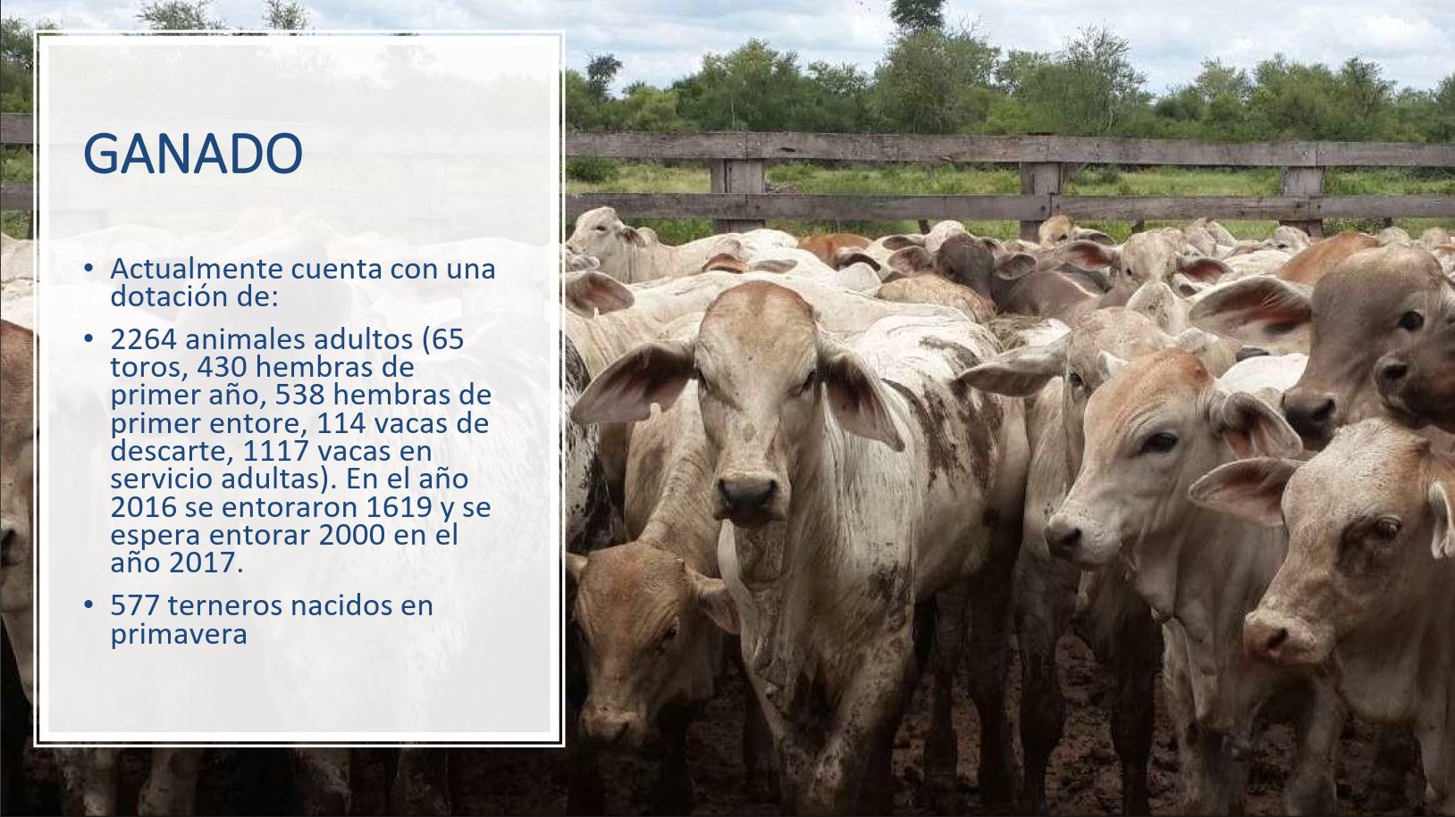 • 2,264 adult animals (65 bulls, 430 yearling heifers, 538 first-calf heifers, 114 retired cows, 1,117 breeding cows). 1,619 calves were bred in 2016; 2,000 are expected for 2017.
